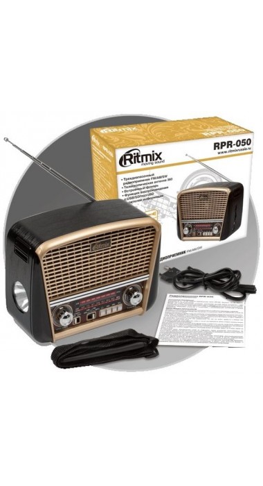 Ritmix RPR-050 – портативный трёхдиапазонный радиоприёмник, охватывающий в том числе и FM-диапазон. Дополнительная функция RPR-050 – воспроизведение mp3-файлов с карт памяти или USB-флэшки. Устройство снабжено встроенным фонарём повышенной яркости.