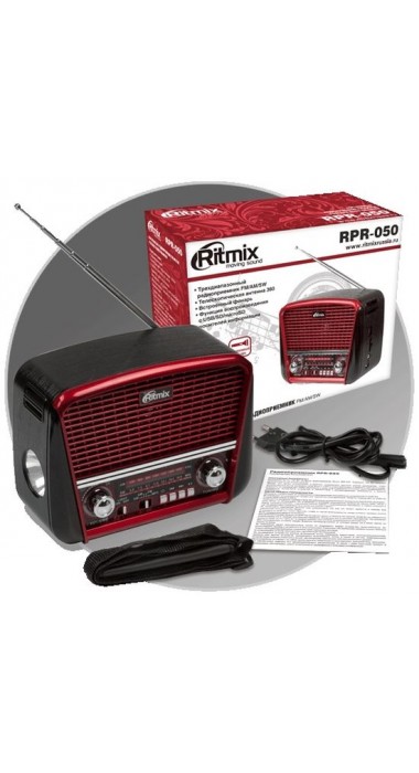 Ritmix RPR-050 – портативный трёхдиапазонный радиоприёмник, охватывающий в том числе и FM-диапазон. Дополнительная функция RPR-050 – воспроизведение mp3-файлов с карт памяти или USB-флэшки. Устройство снабжено встроенным фонарём повышенной яркости.