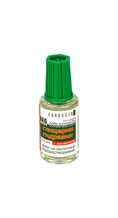 Самый активный флюс, для которого, хоть и с большими оговорками, допускается пайка печатных плат. Закисшие детали, изъеденные коррозией контакты, не представляют никаких проблем для этого флюса. Не смотря на высочайшее качество паек и скорость на грани физических возможностей пайки, не следует употреблять этот флюс для пайки печатных плат, если Вы не планируете качественную отмывку остатков флюса. Промывка водой, желательно горячей.