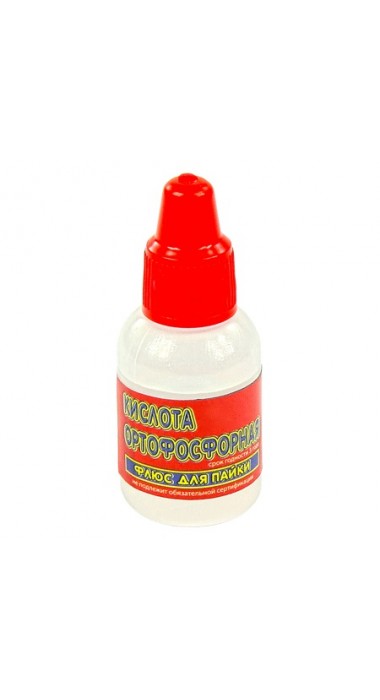 Ортофосфорная кислота- высокоактивный флюс для пайки. Применяется для пайки углеродистых и низколегированных сталей, меди, никеля и их сплавов. Обладает высочайшими флюсующими свойствами. Остатки флюса имеют остаточную активность и со временем поверхность пайки закисает. Удаление остатков можно производить с помощью влажной тряпки, а лучше специальным средством "Удалитель флюса". Если удаление произвести своевременно, то пайки останутся блестящими. Тем не менее, не рекомендуется производить пайку радиосхем и печатных плат, так как остатки под деталями и в микротрещинах проводят электрический ток. Очень часто при пайке железа этот флюс не только не удаляют но и наносят его вокруг после пайки. Образуется стойкое фосфатное покрытие по антикорозионным свойствам похожее на оцинковку.