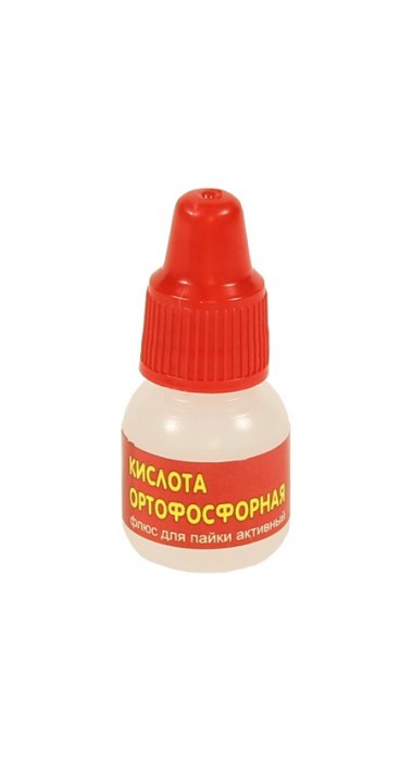 Ортофосфорная кислота- высокоактивный флюс для пайки. Применяется для пайки углеродистых и низколегированных сталей, меди, никеля и их сплавов. Обладает высочайшими флюсующими свойствами. Остатки флюса имеют остаточную активность и со временем поверхность пайки закисает. Удаление остатков можно производить с помощью влажной тряпки, а лучше специальным средством "Удалитель флюса". Если удаление произвести своевременно, то пайки останутся блестящими. Тем не менее, не рекомендуется производить пайку радиосхем и печатных плат, так как остатки под деталями и в микротрещинах проводят электрический ток. Очень часто при пайке железа этот флюс не только не удаляют но и наносят его вокруг после пайки. Образуется стойкое фосфатное покрытие по антикорозионным свойствам похожее на оцинковку.