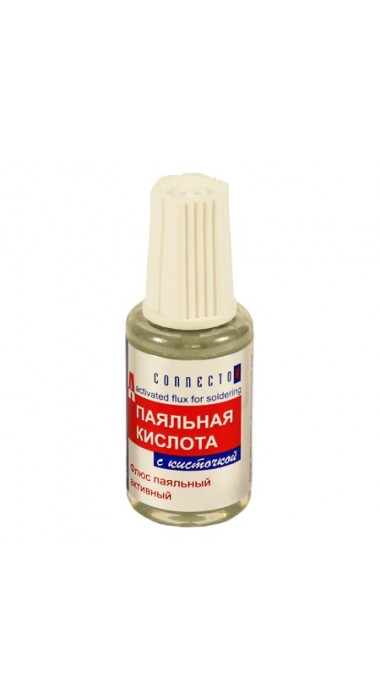 Кислота паяльная- высокоактивный флюс для пайки. Применяется для пайки углеродистых и низколегированных сталей, меди, никеля и их сплавов. Обладает высочайшими флюсующими свойствами. Остатки флюса имеют остаточную активность и со временем поверхность пайки закисает. Удаление остатков можно производить с помощью влажной тряпки, а лучше специальным средством "Удалитель флюса". Если удаление произвести своевременно, то пайки останутся блестящими. Тем не менее, не рекомендуется производить пайку радиосхем и печатных плат, так как остатки под деталями и в микротрещинах проводят электрический ток.