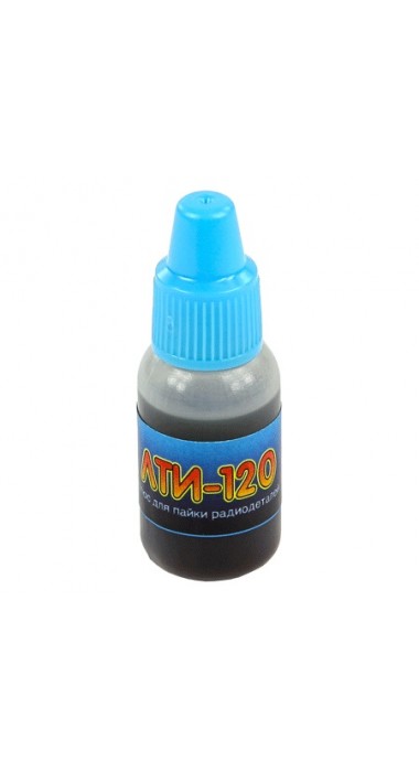 ЛТИ-120 - канифольный активированный флюс для пайки. Пайка печатных плат происходит не просто быстро, а скорее стремительно. Мощный паяльник с этим флюсом спаяет даже оцинкованное железо. ЛТИ-120 часто называют паяльным лаком из-за защитных свойств остатка флюса. Следует помнить, что не покрытые медные проводники (сегодня уже не встречаются) могут приобрести зеленоватый оттенок, что впрочем не ухудшает электрических свойств, а проводник получает защитное покрытие от окисления. Удаление остатков можно производить с помощью спирта, растворителя, а лучше специальным средством "Растворитель канифоли". Если нет специальных требований к чистоте поверхности, то удаление флюса после пайки не обязательно.